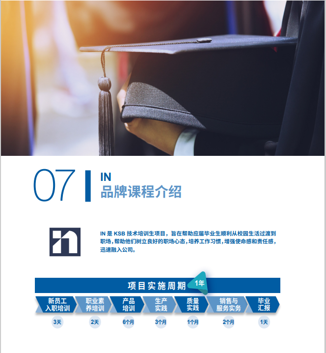 IN是KSB技术培训生项目,旨在帮助应届毕业生顺利从校园生活过渡到职场,帮助他们树立良好的职场心态,培养工作习惯,增强使命感和责任感,迅速融入公司。
