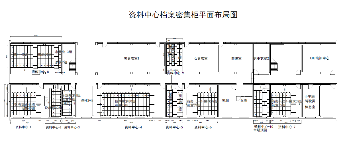 新打造的资料中心位于运营楼1楼。从平面布局图中可以看到由南向北总共划分了10个资料室,分别为MO工厂、物流部、水事业部、质保部、设施部、财务部、合规部、技术部、采购部、服务销售、商务部提供了整洁而又充足的存放空间,并根据各部门的需求设置相应数量的文件柜。